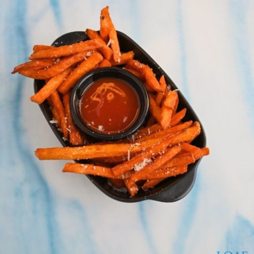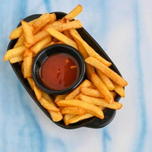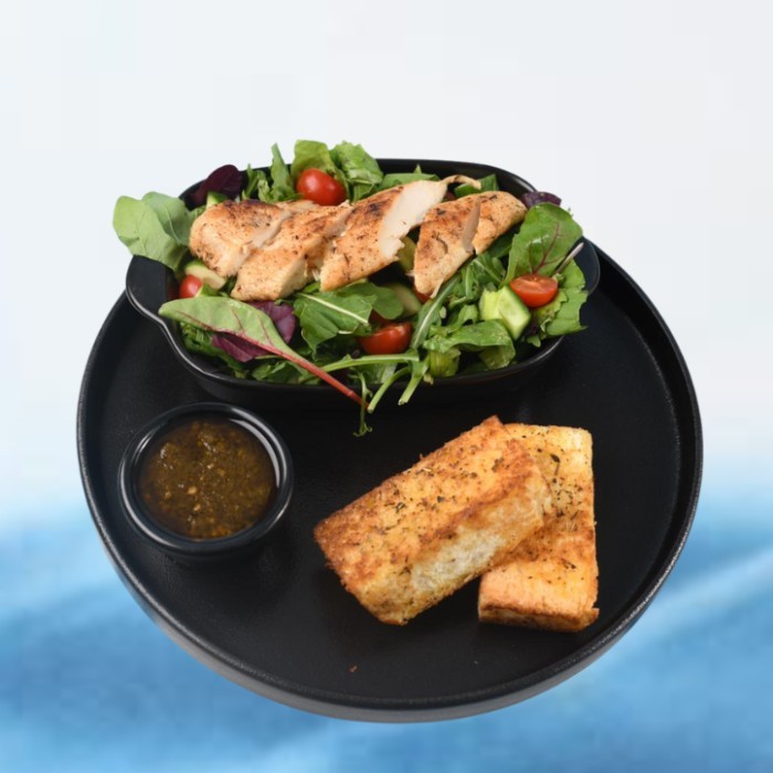 سلطة خضراء، طماطم كرزية مع الدجاج المشوي والخيار وقطع البريوش المحمص مع صوص البيسو الخاص